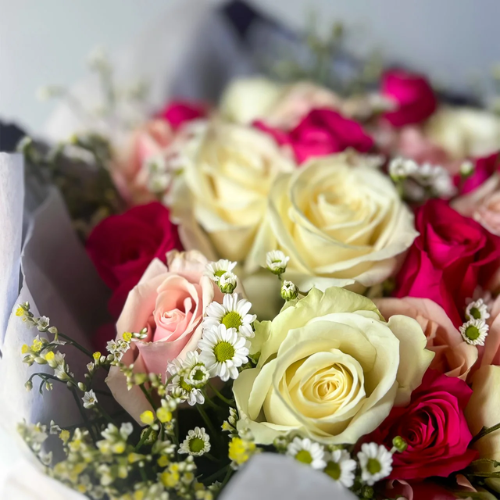 A cherry bouquet of premium quality Roses in bubble gum shades and ivory.ย Item Includes: Premium Quality Roses in shade of pink and white with filler flowers