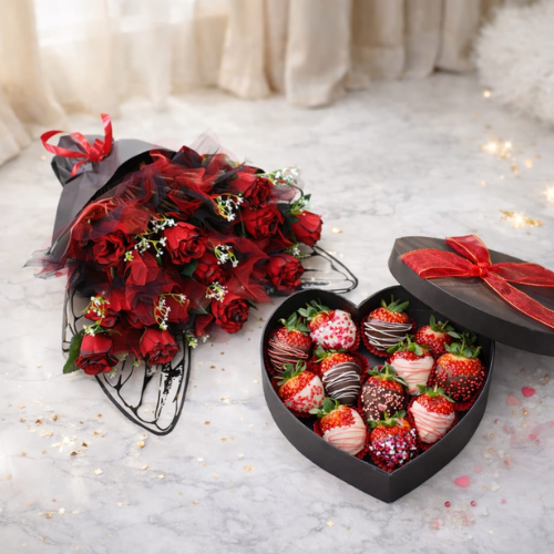Celebrate love in its most beautiful form with the Eternal Love Strawberry Rose Box. This romantic gift set features a stunning bouquet of artificial red roses, elegantly arranged to create a luxurious and lasting display, paired with a heart-shaped box filled with irresistible chocolate-coated strawberries.