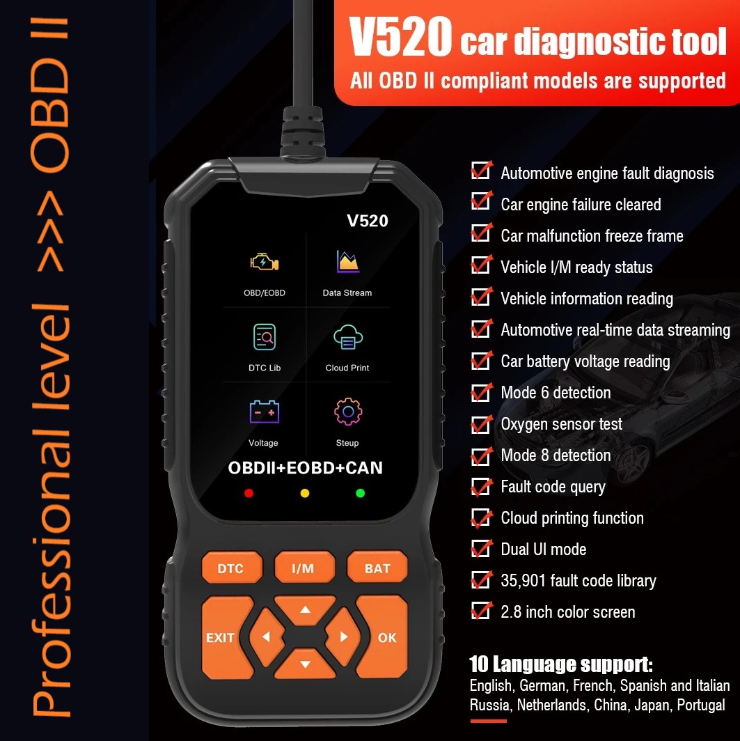 - Whether you’re a DIY enthusiast or a professional, the V520 offers reliable and efficient diagnostics in a compact, multilingual package.