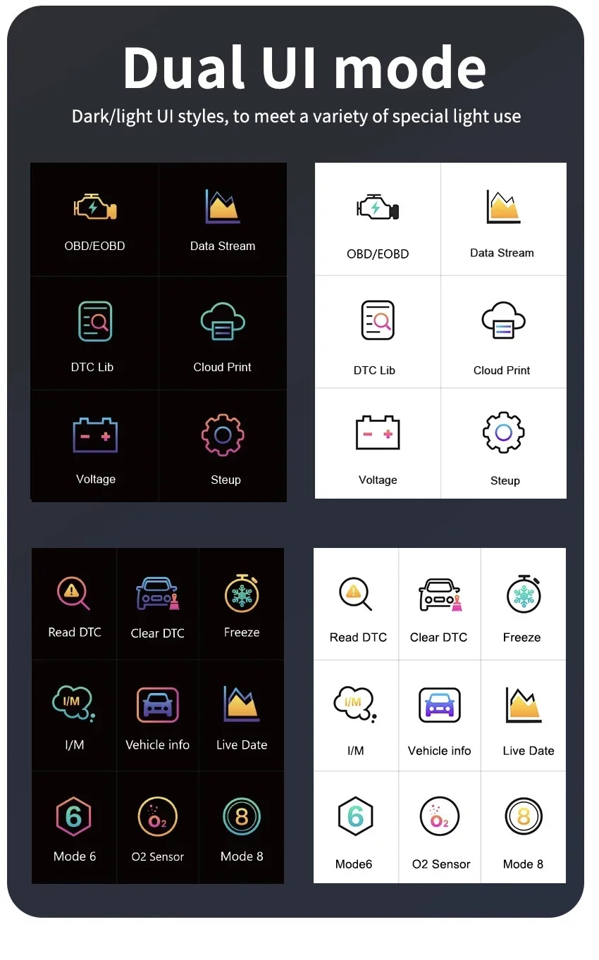 - Equipped with a 2.8 inch color display, it supports a wide range of functions including engine fault diagnosis, fault code clearing, freeze frame data, I/M readiness status, real time data stream analysis, car battery voltage reading, Mode 6 and Mode 8 tests, oxygen sensor testing, and more.