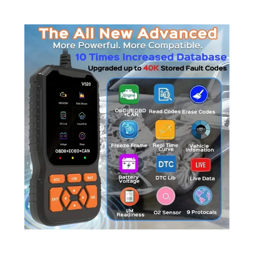 - It allows users to read and clear error codes, monitor engine RPM, vehicle speed, fuel pressure, intake temperature, throttle position, and more though data availability depends on vehicle make and model. Powered by the APM32E103VET6 chip, the V520 operates within a 9V-16V range, with a working current of 36-54mA, and is built to withstand harsh environments with an operating temperature range of -30ยฐC to 70ยฐC.ย